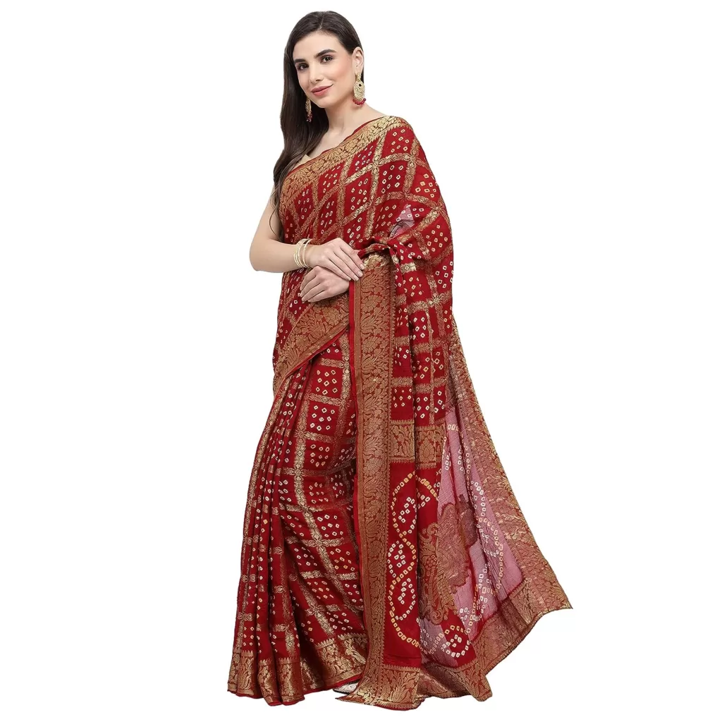 4. बांधनी साड़ी: बांधनी साड़ियाँ उनके विभिन्न रंगों के समाहित पैटर्न के लिए प्रसिद्ध हैं जो साड़ी को एक आकर्षक और उत्तेजना दायक दिखते हैं।