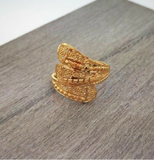 जब किसी वस्तु का आकार सामान्य से हटकर थोड़ा विचित्र हो जाता है तो हमारा ध्यान उस पर सबसे पहले होता है। इस अंगूठी के आकार के कारण ही यह सबके लिए आकर्षण का केंद्र होगी। सोने के ऊपर उकेरे हुए बारीक डिज़ाइन से इसकी सुंदरता अधिक हो चुकी है।