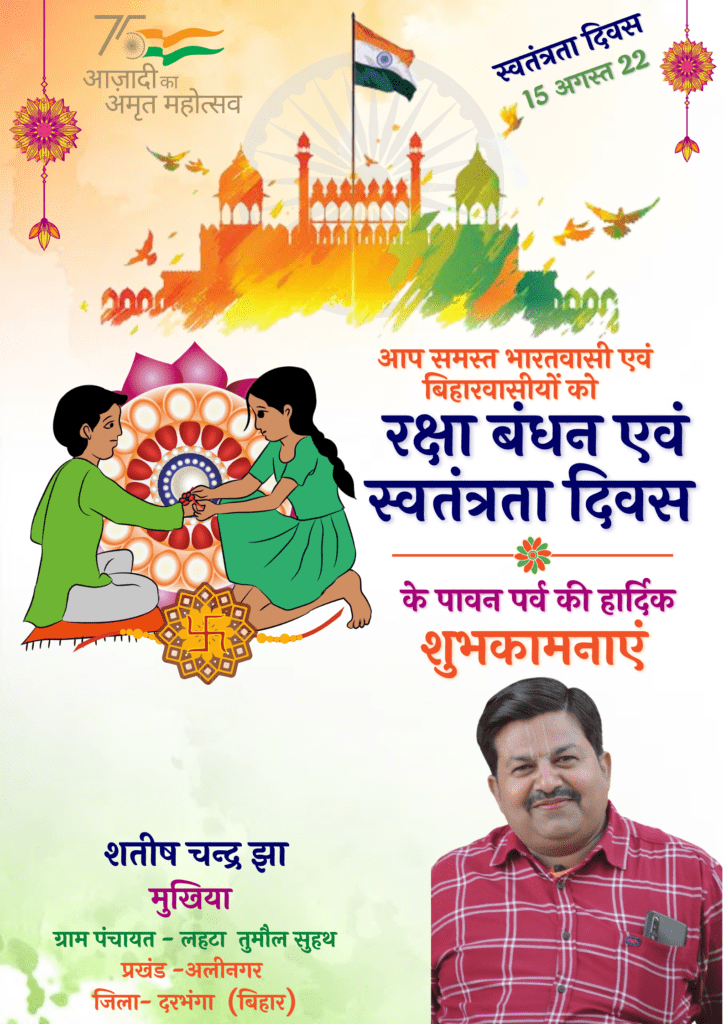 दरभंगा जिला के अलीनगर प्रखंड अंतर्गत लहटा तुमौल सुहथ पंचायत के मुखिया शतीष चन्द्र झा जी ने समस्त देशवासियों को स्वतंत्रता दिवस एवं रक्षा बंधन पर ढेर सारी शुभकामनायें दी।