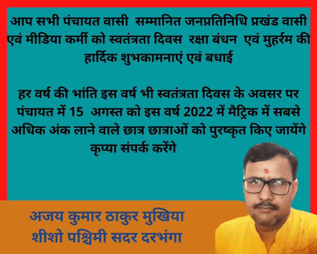 आप सभी पंचायत वासी सम्मानित जनप्रतिनिधि प्रखंड वासी एवं मीडिया कर्मी को स्वतंत्रता दिवस रक्षा बंधन एवं मुहर्रम की हार्दिक शुभकामनाएं एवं बधाई |