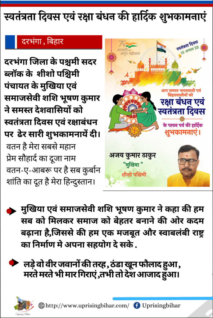 दरभंगा जिला के पश्चमी सदर ब्लॉक के शीशो पश्चिमी पंचायत के मुखिया एवं समाजसेवी शशि भूषण कुमार ने समस्त देशवासियों को स्वतंत्रता दिवस एवं रक्षाबंधन पर ढेर सारी शुभकामनायें दी।