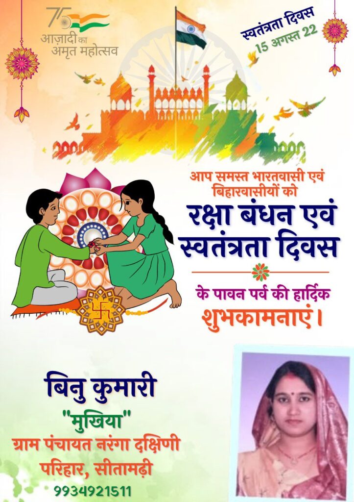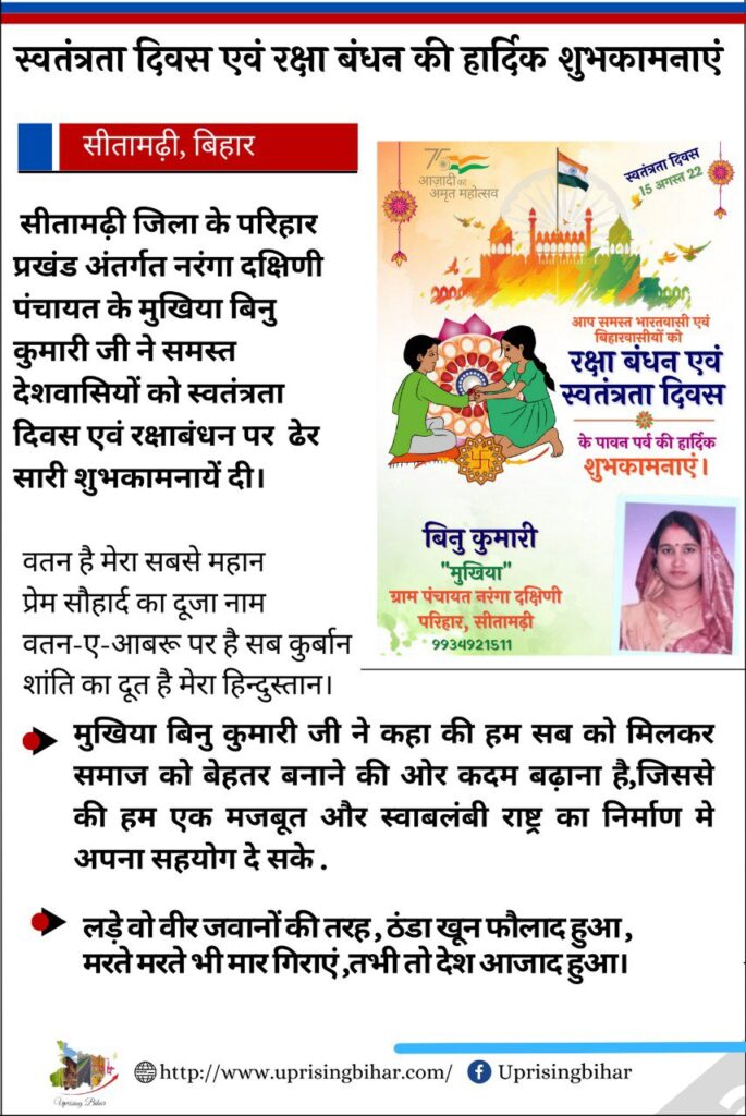 पंचायत के मुखिया बिनु कुमारी जी ने समस्त देशवासियों को स्वतंत्रता दिवस एवं रक्षाबंधन पर ढेर सारी शुभकामनायें दी।