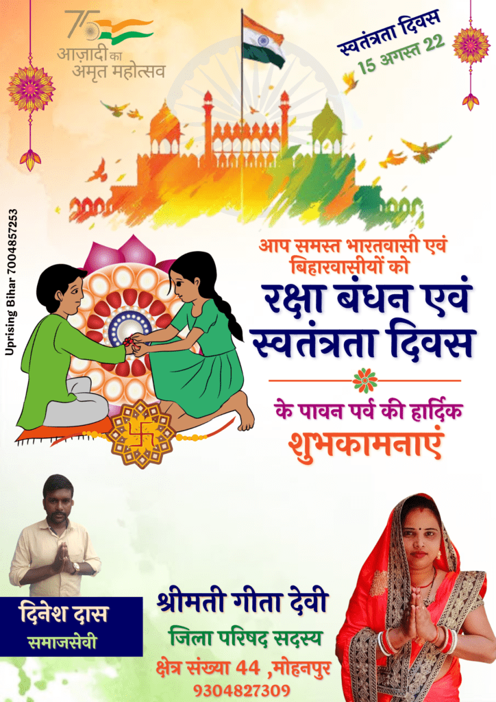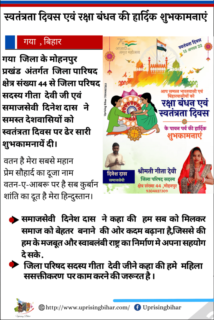 गया जिला के मोहनपुर प्रखंड अंतर्गत जिला पारिषद क्षेत्र संख्या 44 से जिला परिषद सदस्य गीता देवी जी एवं समाजसेवी दिनेश दास ने समस्त देशवासियों को स्वतंत्रता दिवस पर ढेर सारी शुभकामनायें दी।
