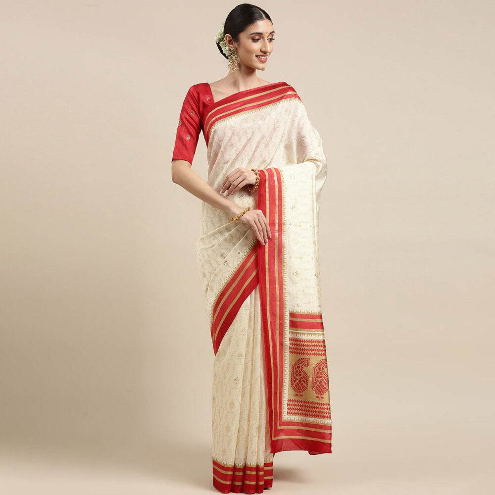 golden silk saree : लाल रंग के साथ सफेद सुनहरी रेशम की साड़ी