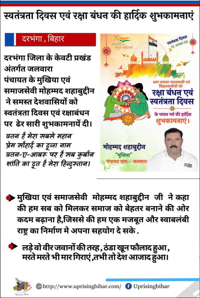 दरभंगा जिला के केवटी प्रखंड अंतर्गत जलवारा पंचायत के मुखिया एवं समाजसेवी मोहम्मद शाहबुद्दीन ने समस्त देशवासियों को स्वतंत्रता दिवस एवं रक्षाबंधन पर ढेर सारी शुभकामनायें दी।