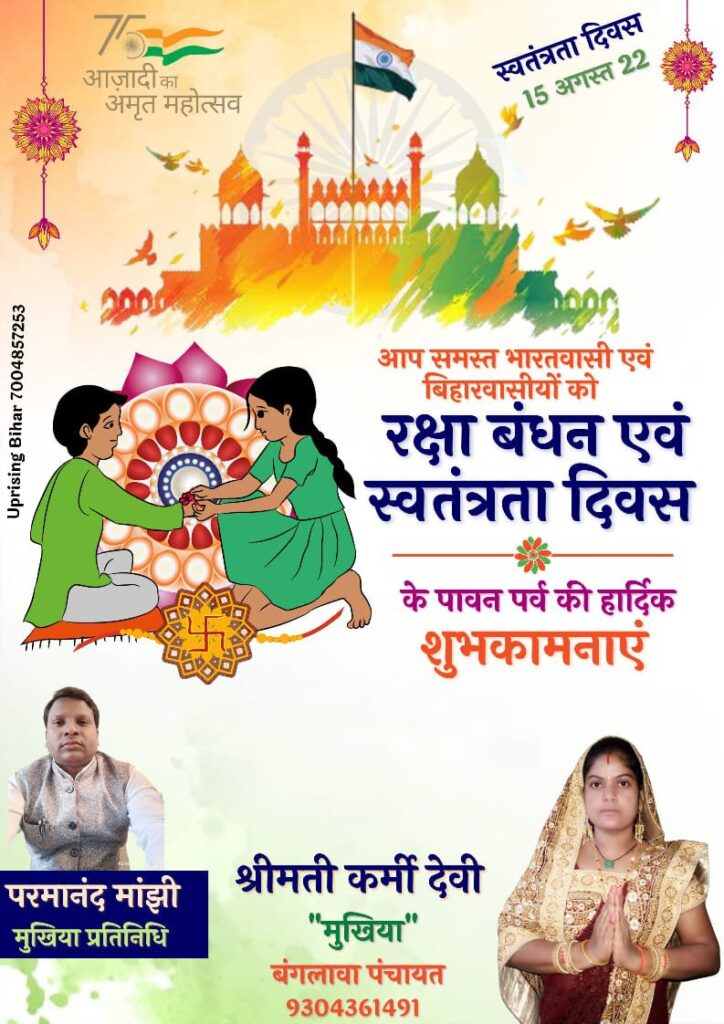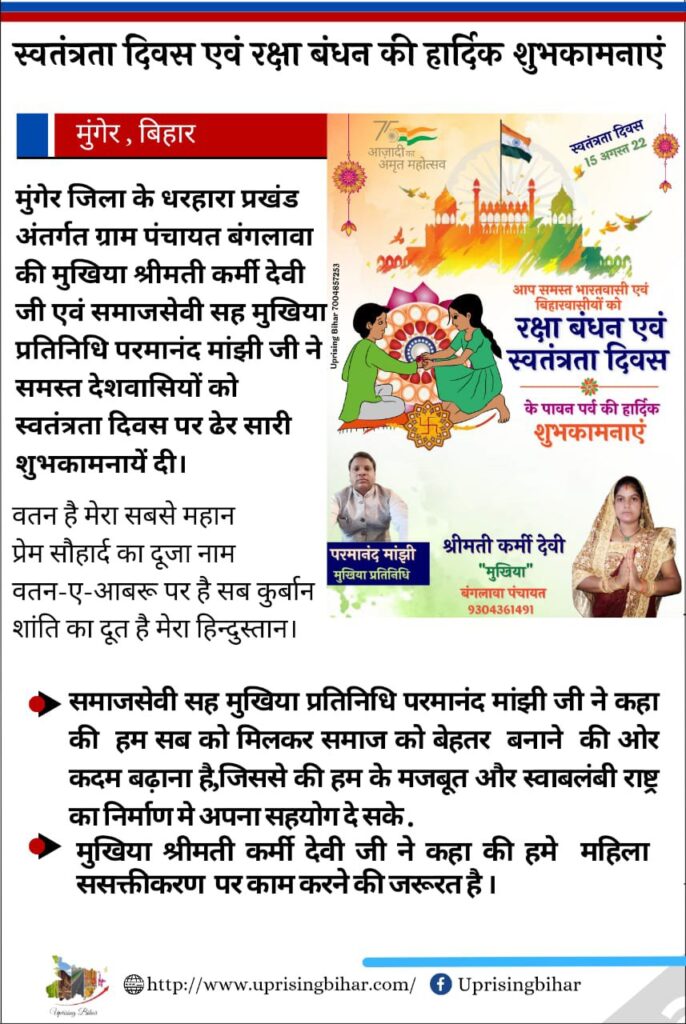 मुंगेर जिला के धरहारा प्रखंड अंतर्गत ग्राम पंचायत बंगलावा की मुखिया श्रीमती कर्मी देवी जी एवं समाजसेवी सह मुखिया प्रतिनिधि परमानंद मांझी जी ने समस्त देशवासियों को स्वतंत्रता दिवस पर ढेर सारी शुभकामनायें दी।
