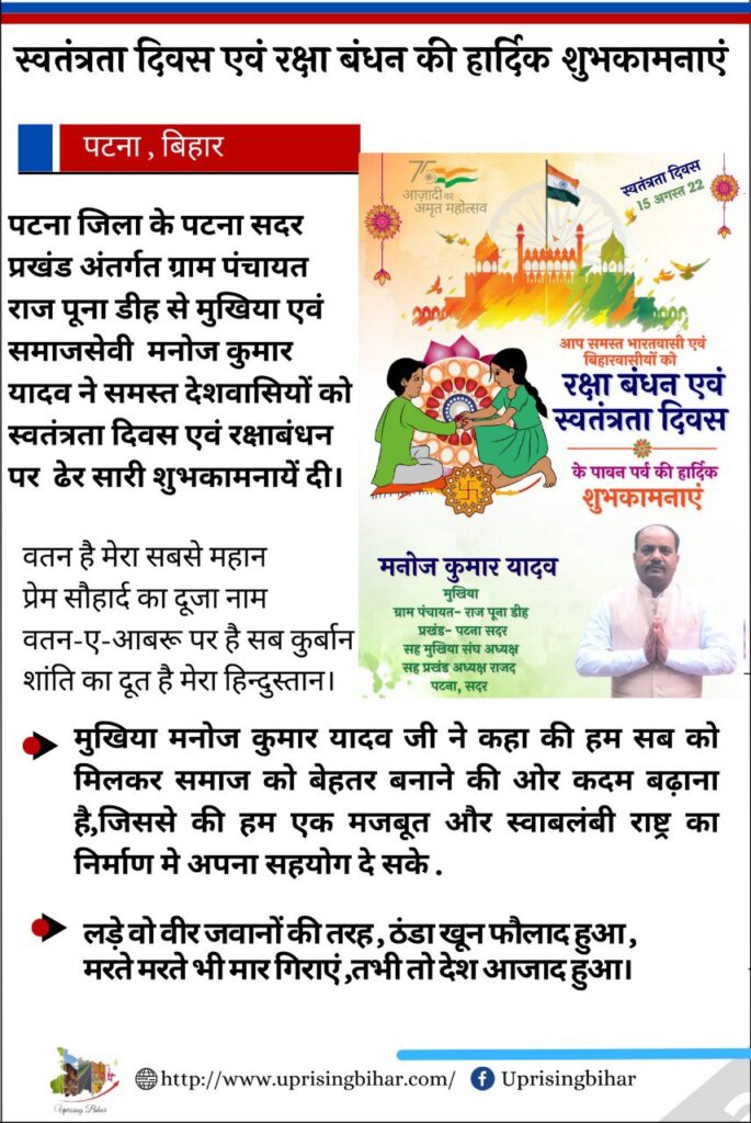 पटना जिला के पटना सदर प्रखंड अंतर्गत ग्राम पंचायत राज पूना डीह से मुखिया एवं समाजसेवी मनोज कुमार यादव ने समस्त देशवासियों को स्वतंत्रता दिवस एवं रक्षाबंधन पर ढेर सारी शुभकामनायें दी।