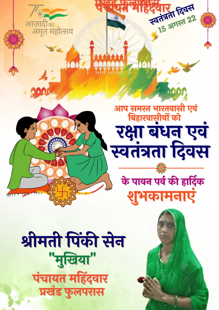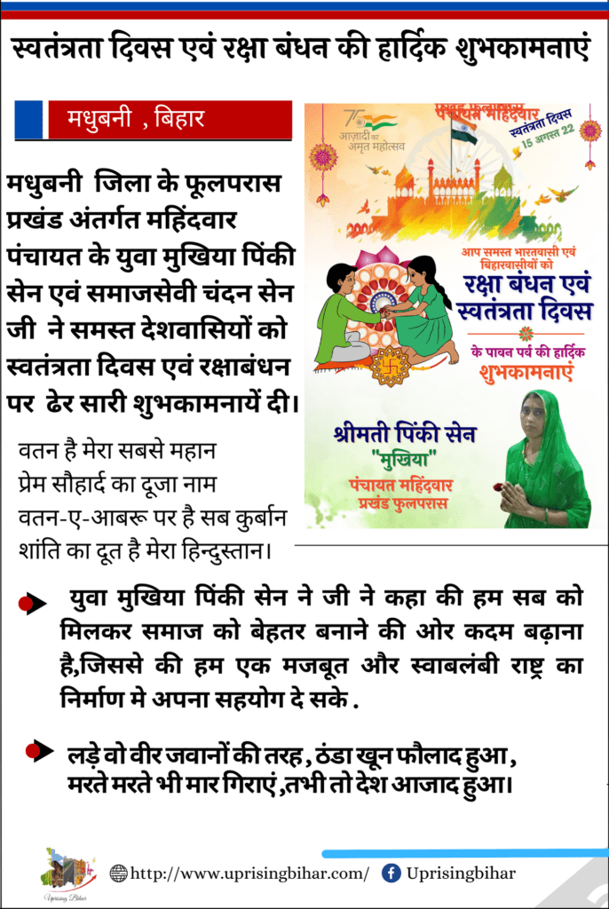 मधुबनी जिला के फूलपरास प्रखंड अंतर्गत महिंदवार पंचायत के युवा मुखिया पिंकी सेन एवं समाजसेवी चंदन सेन जी ने समस्त देशवासियों को स्वतंत्रता दिवस एवं रक्षाबंधन पर ढेर सारी शुभकामनायें दी।