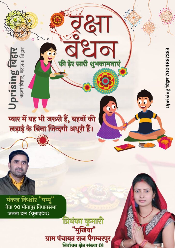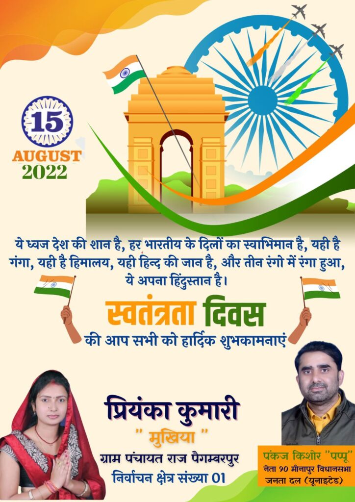 मुजफ्फरपुर जिला के मीनापुर प्रखंड अंतर्गत ग्राम पंचायत पैगम्बरपुर से मुखिया प्रियंका देवी जी एवं समाजसेवी सह नेता 90 मीनापुर विधानसभा (जनता दल (यूनाइटेड) पंकज किशोर जी ने समस्त देशवासियों को स्वतंत्रता दिवस एवं रक्षाबंधन पर ढेर सारी शुभकामनायें दी