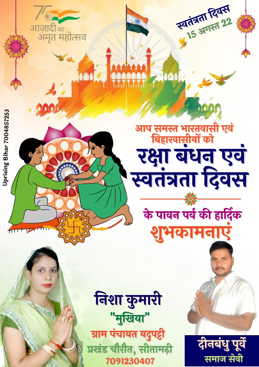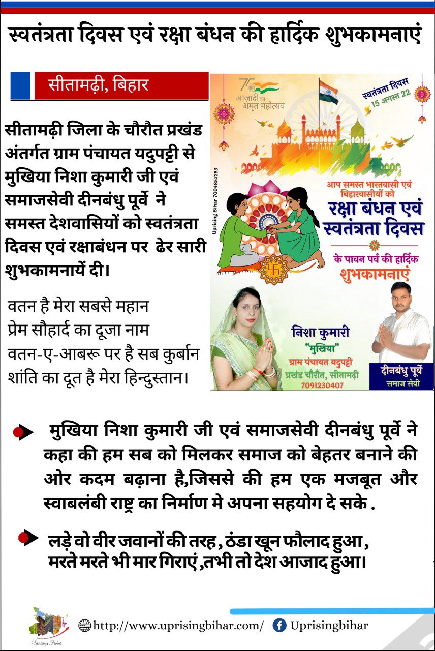 सीतामढ़ी जिला के चौरौत प्रखंड अंतर्गत ग्राम पंचायत यदुपट्टी से मुखिया निशा कुमारी जी एवं समाजसेवी दीनबंधु पूर्वे ने समस्त देशवासियों को स्वतंत्रता दिवस एवं रक्षाबंधन पर ढेर सारी शुभकामनायें दी।
