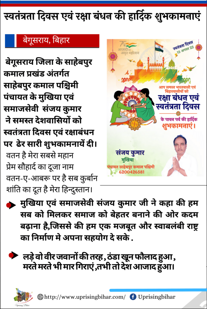 बेगूसराय जिला के साहेबपुर कमाल प्रखंड अंतर्गत साहेबपुर कमाल पश्चिमी पंचायत के मुखिया एवं समाजसेवी संजय कुमार ने समस्त देशवासियों को स्वतंत्रता दिवस एवं रक्षाबंधन पर ढेर सारी शुभकामनायें दी।