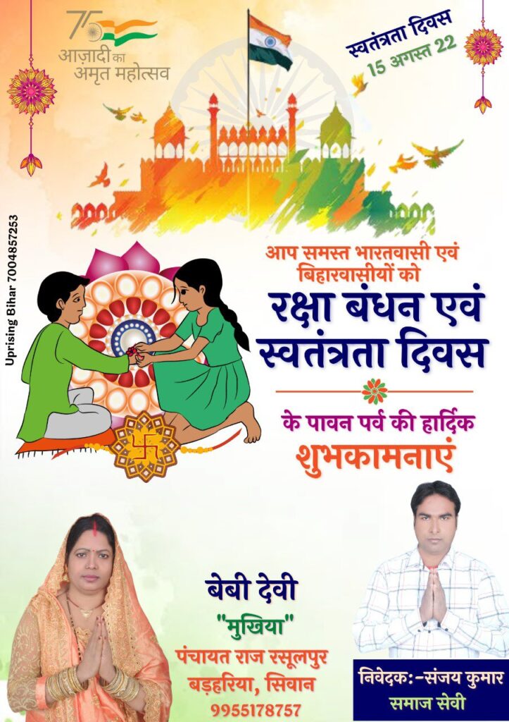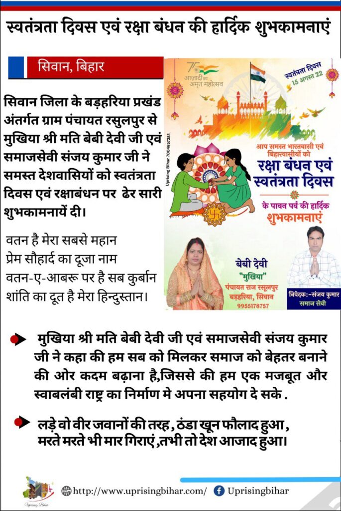 सिवान जिला के बड़हरिया प्रखंड अंतर्गत ग्राम पंचायत रसुलपुर से मुखिया श्री मति बेबी देवी जी एवं समाजसेवी संजय कुमार जी ने समस्त देशवासियों को स्वतंत्रता दिवस एवं रक्षाबंधन पर ढेर सारी शुभकामनायें दी