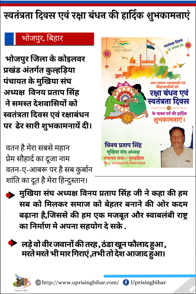 भोजपुर जिला के कोइलवर प्रखंड अंतर्गत कुल्हड़िया पंचायत के मुखिया संघ अध्यक्ष विनय प्रताप सिंह ने समस्त देशवासियों को स्वतंत्रता दिवस एवं रक्षाबंधन पर ढेर सारी शुभकामनायें दी।