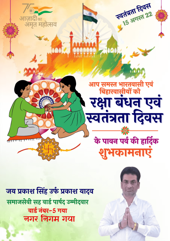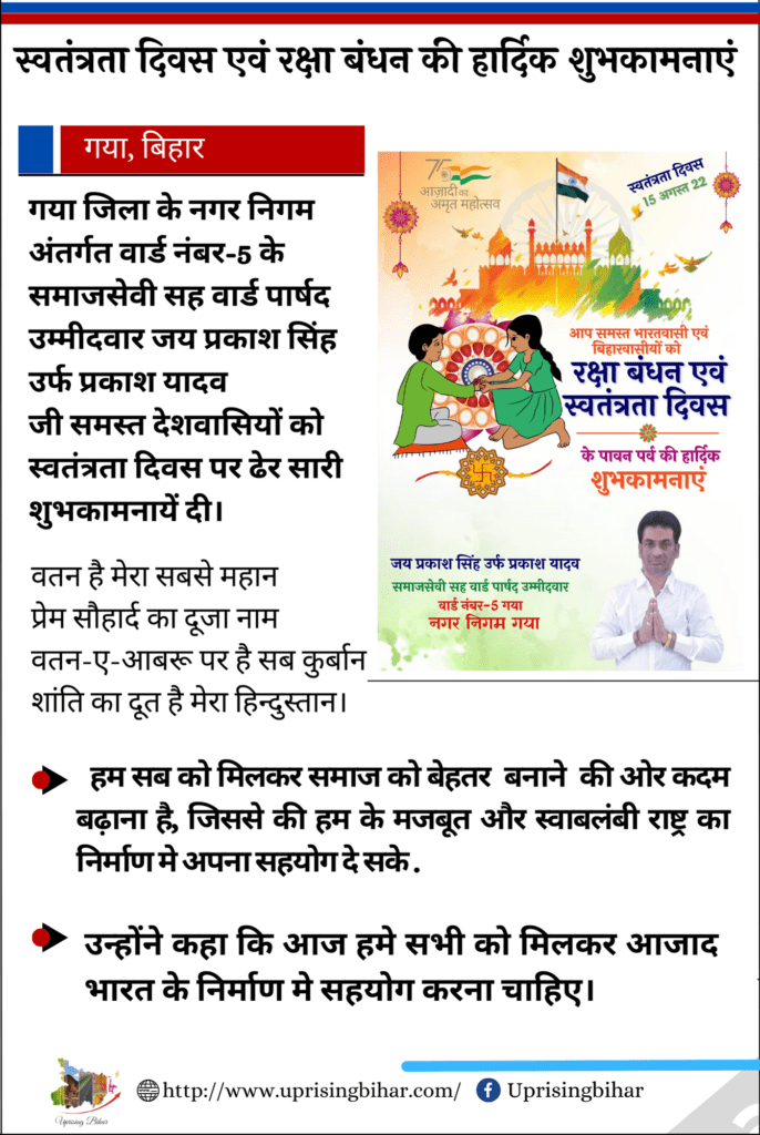गया जिला के नगर निगम अंतर्गत वार्ड नंबर-5 के समाजसेवी सह वार्ड पार्षद उम्मीदवार जय प्रकाश सिंह उर्फ प्रकाश यादव जी समस्त देशवासियों को स्वतंत्रता दिवस पर ढेर सारी शुभकामनायें दी।