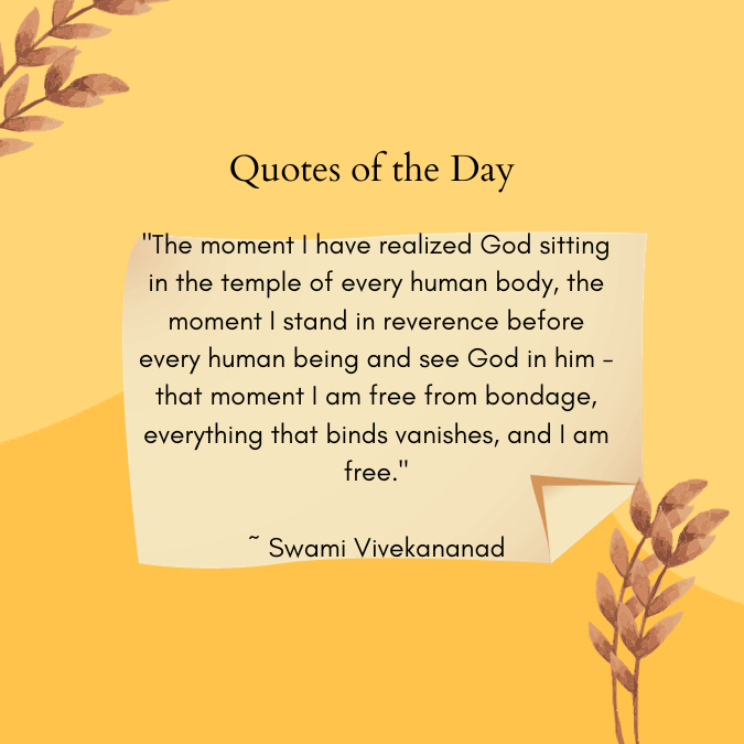 “The moment I have realized God sitting in the temple of every human body, the moment I stand in reverence before every human being and see God in him – that moment I am free from bondage, everything that binds vanishes, and I am free.” ~ Swami Vivekananad