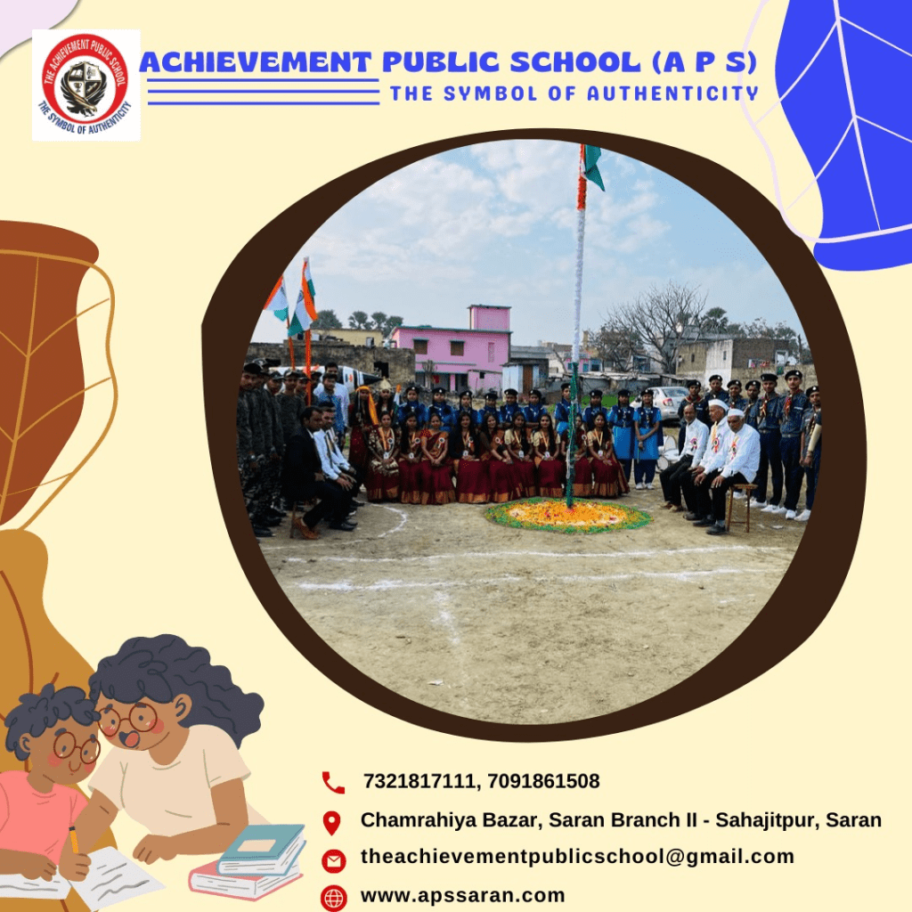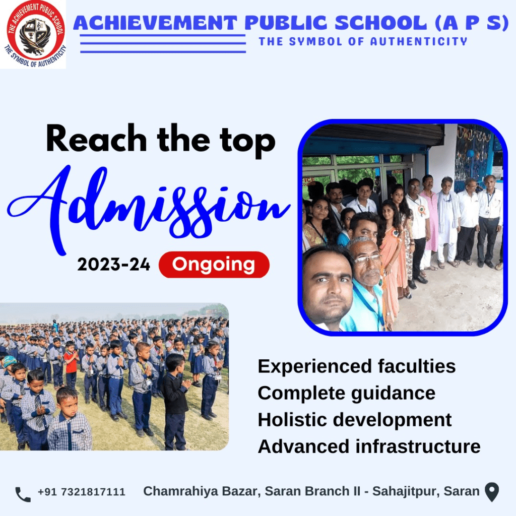 अचीवमेंट पब्लिक स्कूल सरन एक संस्था है जो बच्चों को उनके स्वस्थ विकास के लिए उच्च मानकों पर ध्यान देती है। यह एक समझदार और पेशेवर संस्था है जो बच्चों को स्वतंत्र, सक्रिय और सफल नागरिक के रूप में तैयार करती है।